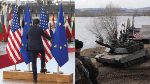 Left: The U.S. and European Union flags are displayed ahead of a European Council meeting at the EU headquarters in